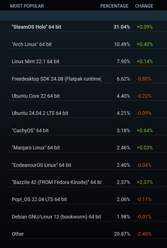 Seemingly for the first time, the Bazzite gaming-focused Linux distro has appeared on the Steam Hardware Survey. Well done to the Bazzite team for making such an amazing distro for gaming (and now just general usage as a while too)! Been my main choice for going on a year now for my general use distro, and I haven’t looked back.