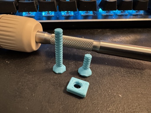 Design to be a drop in replacement for 10-32 screws with a much, much higher pitch. These screws are extremely easy to print, is reliable enough that it can hold some weight.