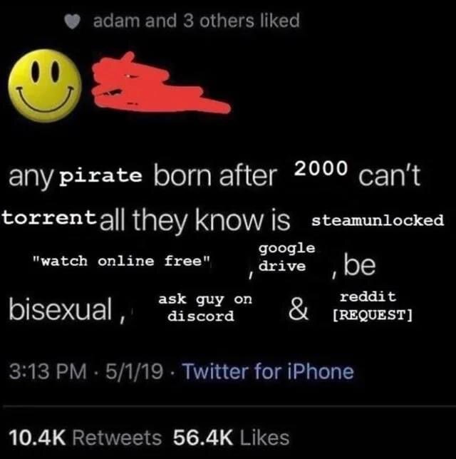 Maerman@lemmy.ml to Piracy: ꜱᴀɪʟ ᴛʜᴇ ʜɪɢʜ ꜱᴇᴀꜱ@lemmy.dbzer0.comEnglish · 1 year agoPity, really.lemmy.mlimagemessage-square196linkfedilinkarrow-up1652arrow-down152