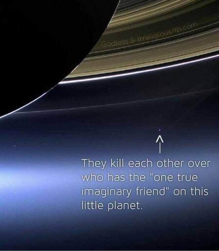 It’s more highlighting how silly it is in the grand scheme of the universe (whether we are alone or not) that we as a civilization are constantly fighting amongst ourselves with how we want to believe we got here.
