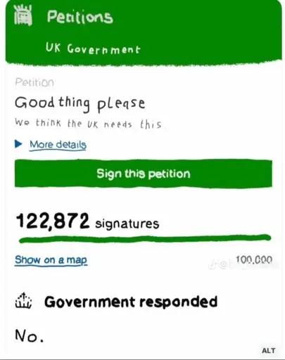 arrow-up1314arrow-down1imageGood thing pleaselemmy.blahaj.zoneals@lemmy.blahaj.zone to UK Politics@feddit.ukEnglish · 4 days agomessage-square11linkfedilink