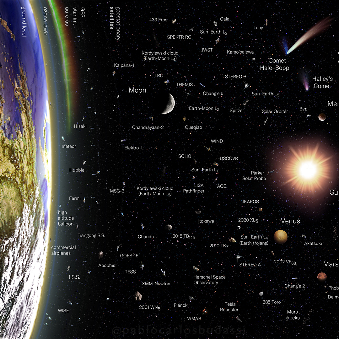 This vertically oriented logarithmic map spans nearly 20 orders of magnitude, taking us from planet Earth to the edge of the Observable Universe. The scheme locates notable astronomical objects of various scales: spacecraft, moons, planets, star systems, nearby galaxies, and notable large-scale structures are some of the objects indicated.