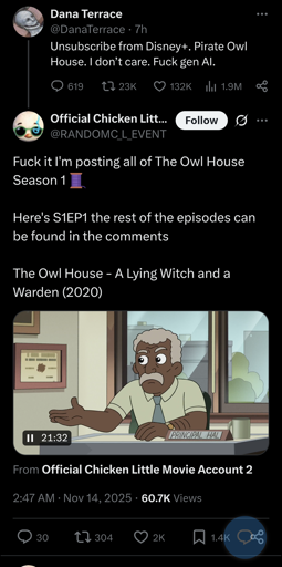 arrow-up1469arrow-down1image'The Owl House’ creator Dana Terrace situation with Disney+ positive views on AI generated contentlemmy.mlLiamBox@lemmy.ml to Piracy: ꜱᴀɪʟ ᴛʜᴇ ʜɪɢʜ ꜱᴇᴀꜱ@lemmy.dbzer0.comEnglish · 4 months agomessage-square56linkfedilinkcross-posted to: fuck_ai@lemmy.world