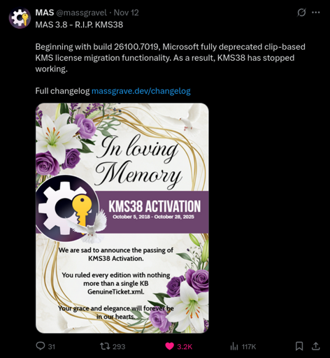 mr_MADAFAKA@lemmy.ml to Piracy: ꜱᴀɪʟ ᴛʜᴇ ʜɪɢʜ ꜱᴇᴀꜱ@lemmy.dbzer0.comEnglish · 21 days agoMicrosoft has blocked Massgrave's KMS38 activation method for Windowslemmy.mlimagemessage-square127linkfedilinkarrow-up1407arrow-down12file-text