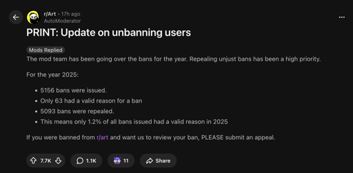 And perhaps I’m a bit naive here, but I’d like to think that no respectable instance admins on the fediverse would allow the brazen behaviour of the r/art team. They’d have long been removed.