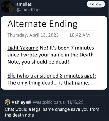 tgirlschierke@lemmy.blahaj.zone to Animemes@ani.socialEnglish · 2 months agoAlternate Ending [Death Note]lemmy.blahaj.zoneimagemessage-square15linkfedilinkarrow-up1289arrow-down14