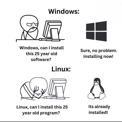 Yeah, I wouldn’t expect it to work, so I wouldn’t expect a meme to imply that Linux has great backwards compatibility, when things change somewhat rapidly in mainstream Linux, making it quite hard to maintain.