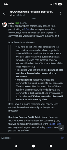 HappySkullsplitter@lemmy.world to Reddit@lemmy.world · 2 months agoGetting banned from r/pics randomlylemmy.worldimagemessage-square22linkfedilinkarrow-up198arrow-down13file-text