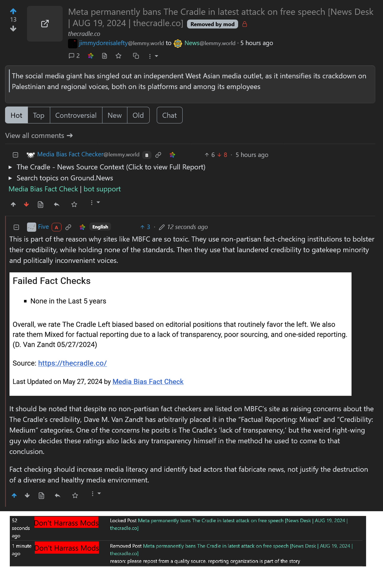 I know MBFC is a controversial tool, but there must be some kind of moderation, otherwise you end up like !worldnews@lemmy.ml