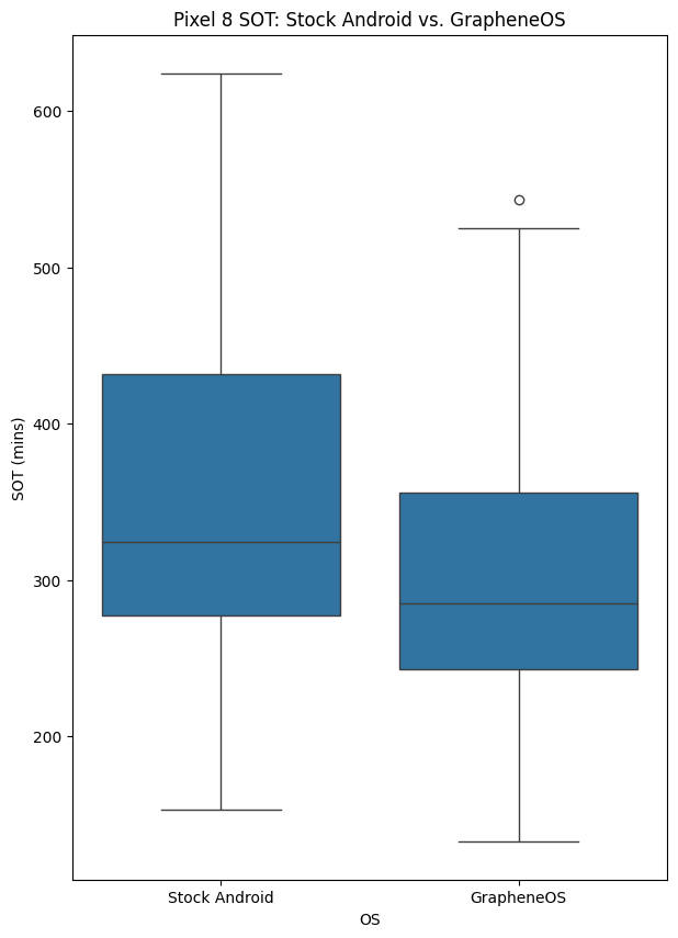 On my Pixel 8, stock seems to offer better battery life compared to GrapheneOS, with a mean SOT of 06:51 on stock, versus a mean SOT of 06:03 on GOS.