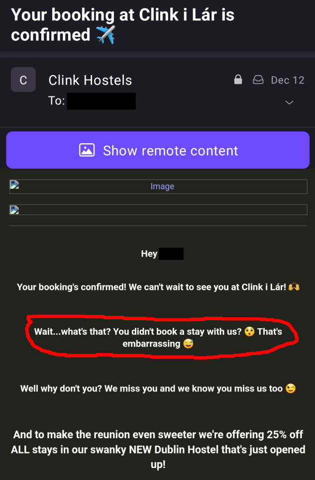 A hostel company I stayed with a while back emailed me with the subject: “Your booking is confirmed!”. This made me frantically check all my accounts since I hadn’t booked any hostels recently. I was super concerned until I opened the email and saw… it was a stupid marketing email…
