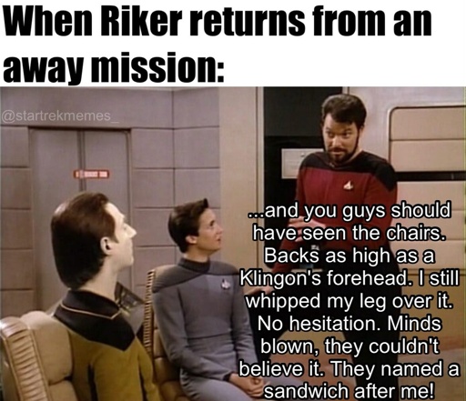 and B - Do you also think that every meme featuring Kirk should have some indication that he’s speaking in Shatner’s distinctive cadence? If it was Sisko, Avery Brooks projecting to the rafters like he’s in a stage play? What about Kate Mulgrew’s mid-Atlantic accent for Janeway?